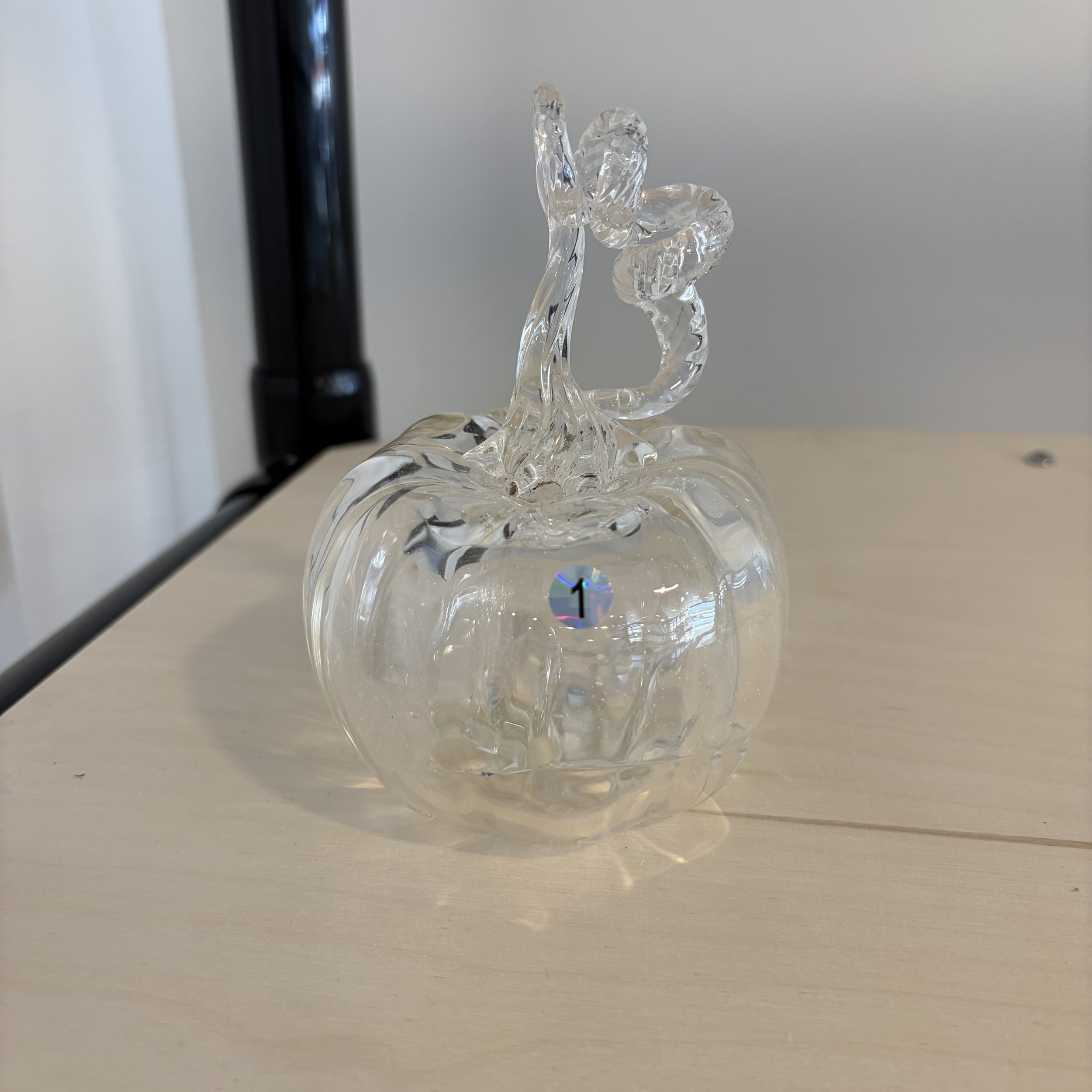 Hand-blown glass pumpkin. Clear twisted stem. One of a kind — no two pieces are alike.