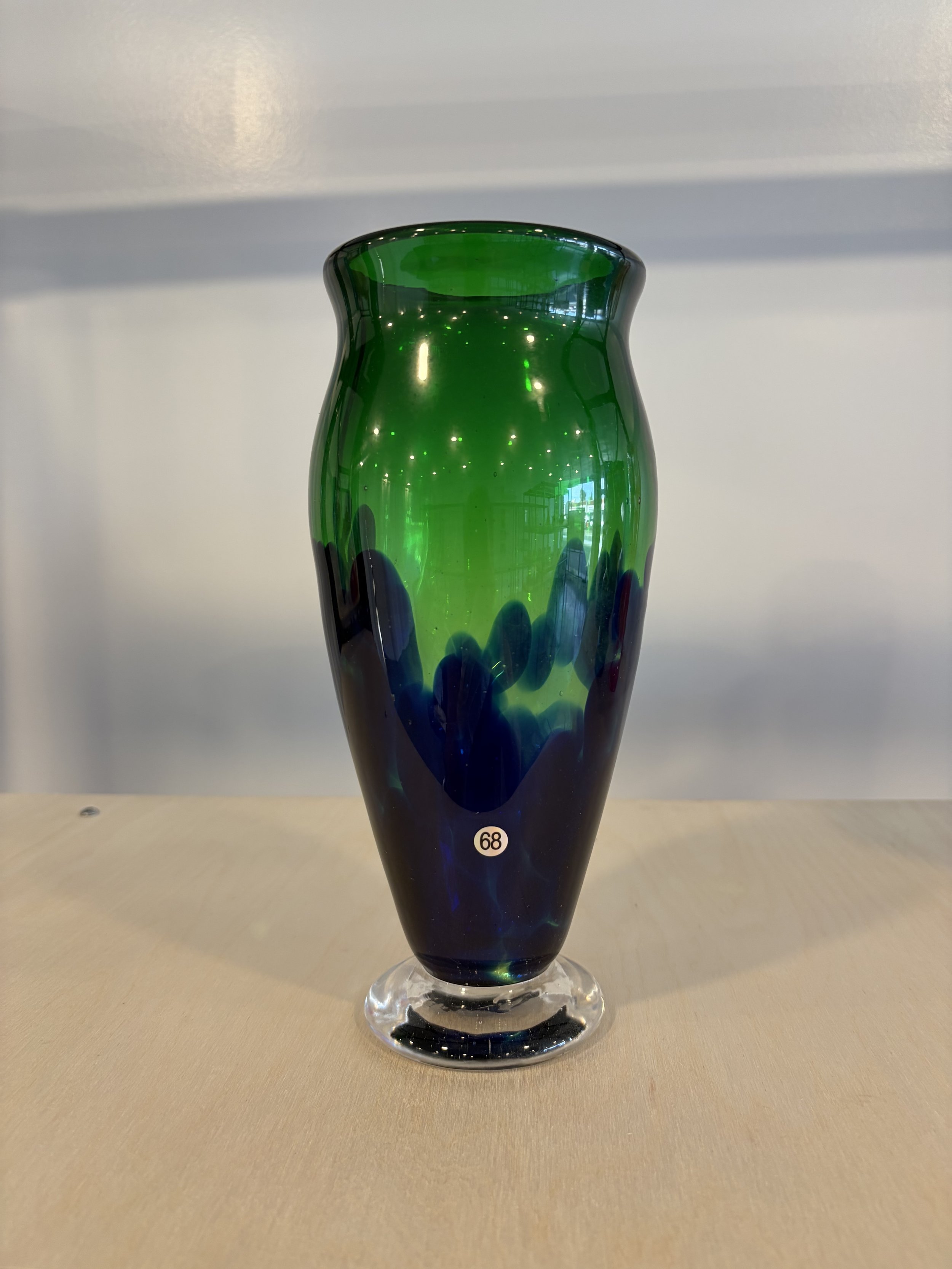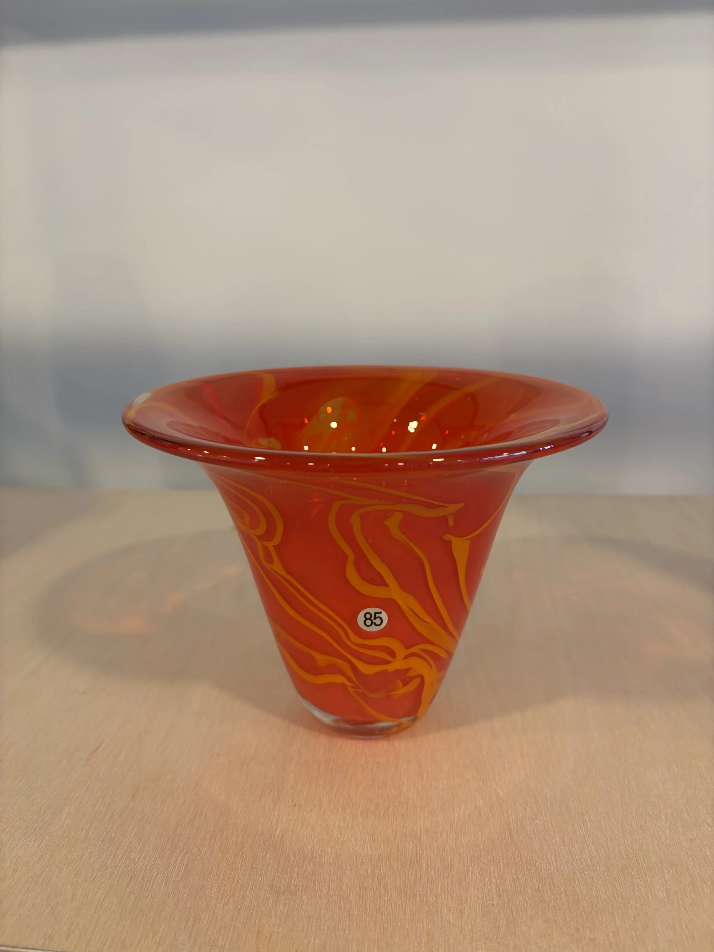 Hand-blown glass flared vase. Wide conical flared bowl, swirl pattern. One of a kind — no two pieces are alike.
